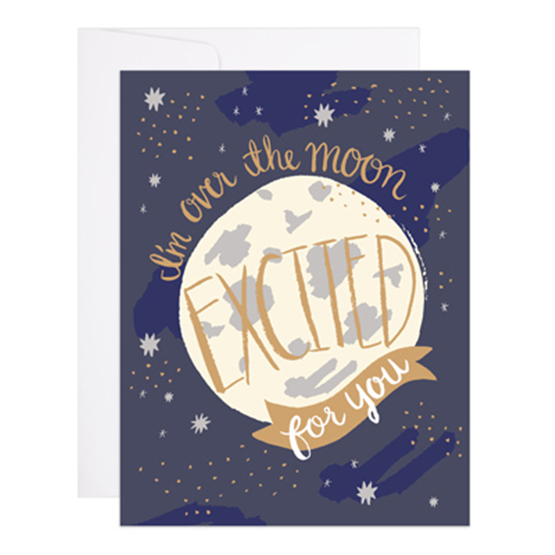Over The Moon is hand illustrated digitally printed gold foil pressed printed with lots of care on natural white cover stock Blank interior matching envelope Individually packaged A2 4 25 x 5 5