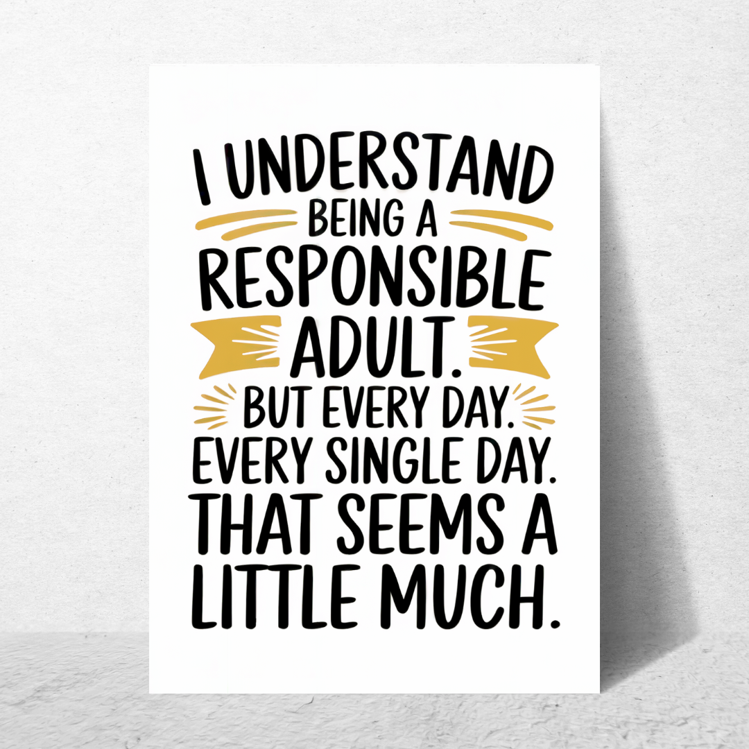 Surprise your friends and family with our Responsible Adult Greeting Card! This clever card is perfect for celebrating responsible behavior, but with a quirky twist. With its playful language and humorous illustrations, it's sure to bring a smile to anyone's face. Perfect for all occasions!