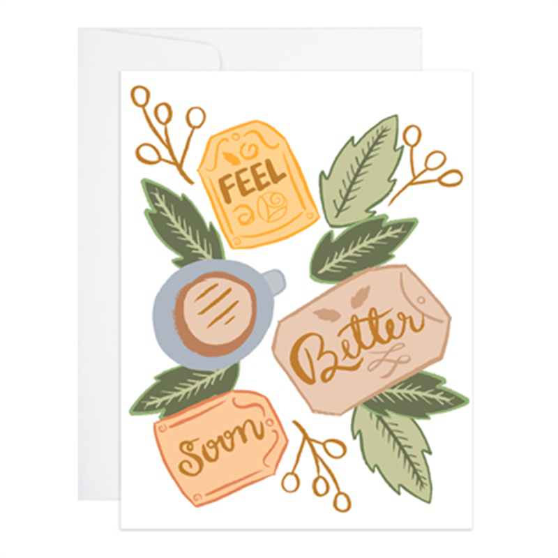 Tea Time Feel Better is hand illustrated digitally printed copper foil pressed printed with lots of care on natural white cover stock Blank interior matching envelope Individually packaged A2 4 25 x 5 5
