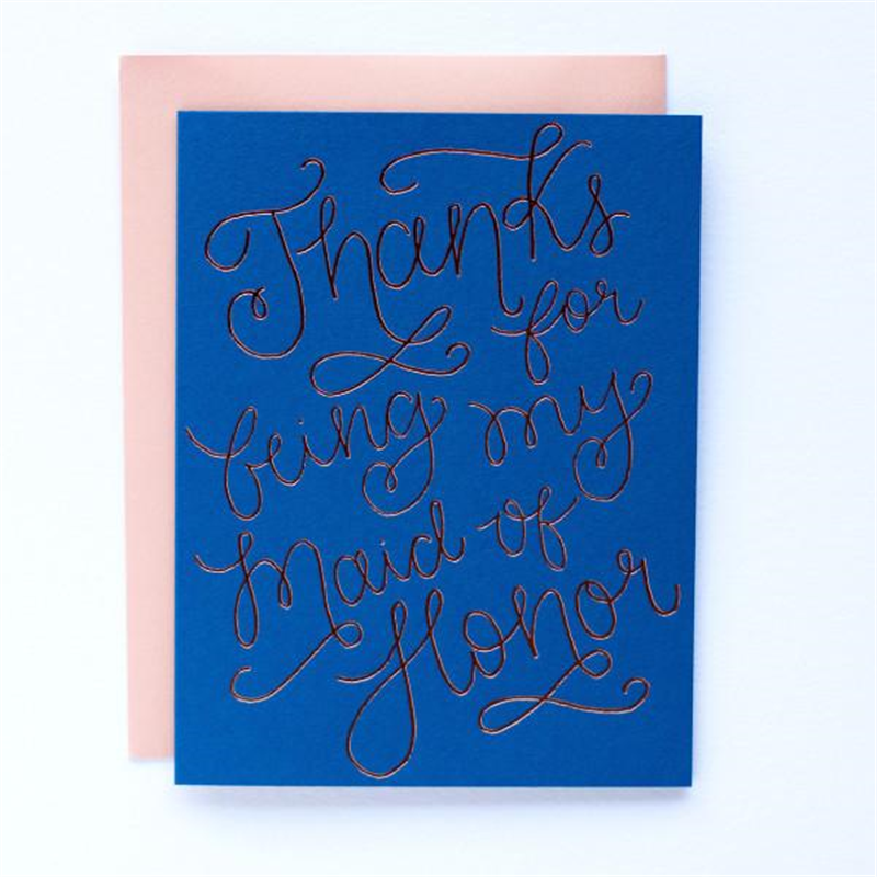 Thanks Maid of Honor is hand illustrated digitally printed copper foil pressed printed with lots of care on natural white cover stock Blank interior matching envelope Individually packaged A2 4 25 x 5 5